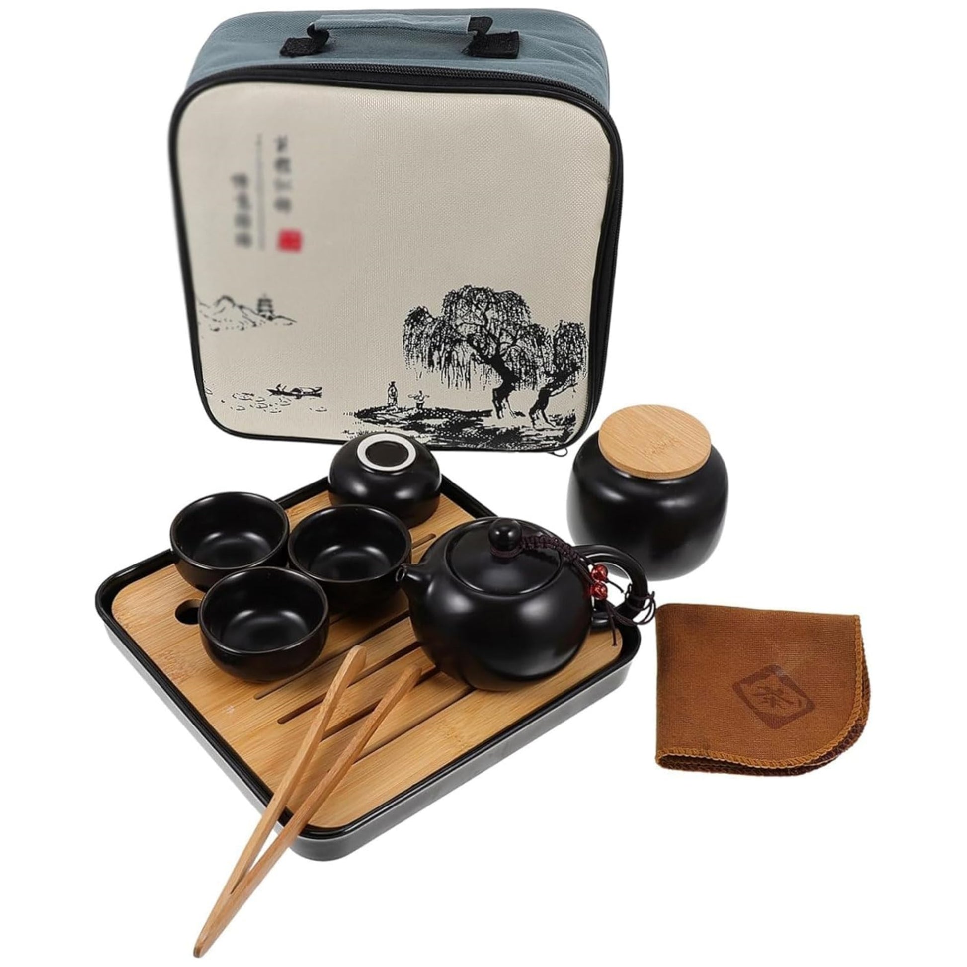 Portable Tea Pot Cup Set with Tray Infuser - Travel Ceramic Tea set (Black)