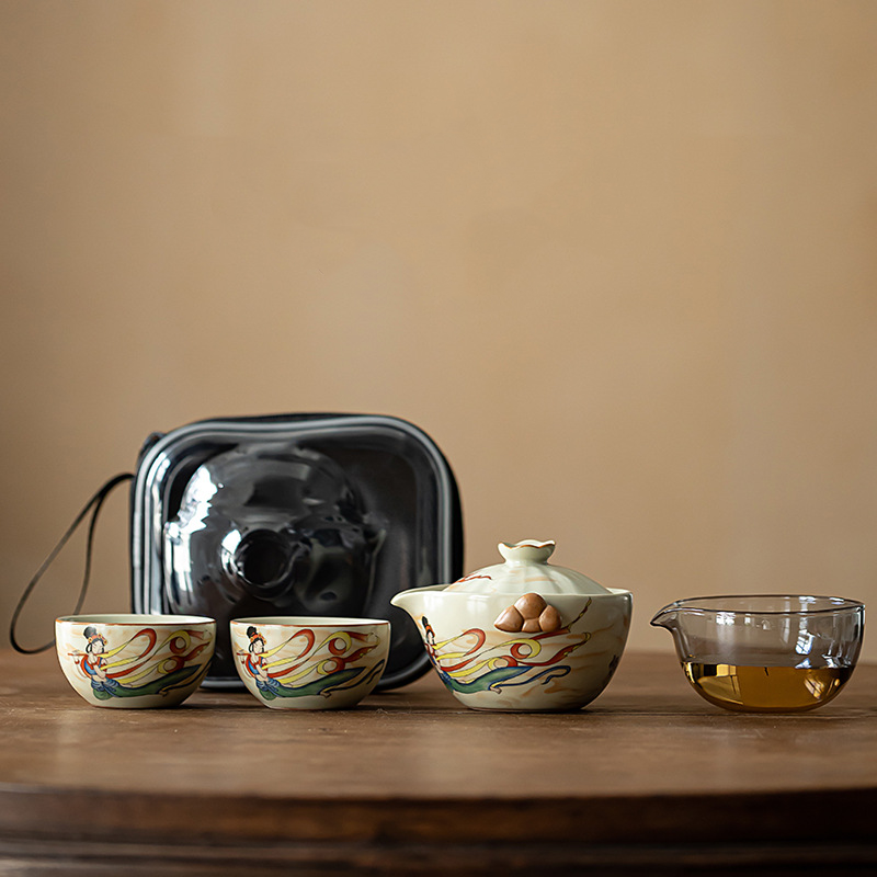 Dunhuang Flying Fairy Ru Kiln Ceramic Quick Guest Cup, one pot and two Cups Outdoor Portable Travel Tea Set (beige)